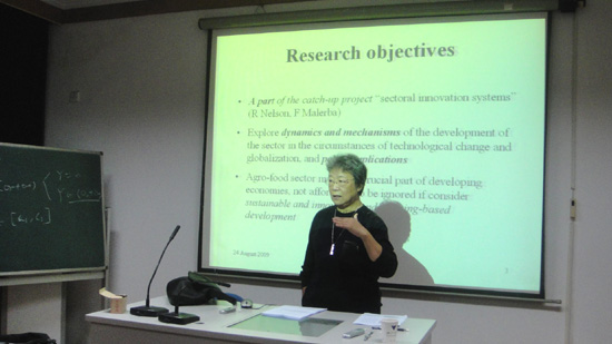 (3)10月13日上午,顾教授为“卡特”师生报告了其最近的研究成果《The Agro-food Sector in Catching-up Countries:A Comparative Study of four cases from the Sectoral Systems Perspective》,这项研究尝试使用sectoral innovation system的研究路线,对四个发展中国家的四种主要粮农作物(巴西-大豆,中国-蔬菜,哥斯达黎加-咖啡,尼日利亚-木薯)进行了深入研究,得出了追赶型国家的粮农产品走的是一条高度动态化、多样化的道路的结论,例如整体中处于追赶中的巴西、哥斯达黎加等国可以在农业某个部门中创造技术,挤入竞争的前沿;强调制度在追赶型国家中的重要作用,以及制度与技术的共同演化;强调知识在快速发展中的重要作用;强调传统知识与农户创新的重要性。报告给师生们极大地鼓舞,参加报告的师生们对顾教授的报告给予高度评价,认为此报告具有鲜明的激动人心的观点,具有非常大的信息量。同时,这次报告也给研究生们如何进行科研工作进行了一次深刻的教育。