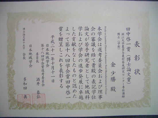 10月11日,日本区域学会第46届年会的全体会员大会(在日本广岛大学举行)上公布了2009年获“田中启一赏”(博士论文赏)的5篇博士论文,CARD金少胜博士2008年提交给日本国立筑波大学的博士论文“Location Choices of Japanese Food Manufactures in China”(指导教官:德永澄宪教授)名列其中,学会肯定了CARD金少胜博士在日资食品企业在华投资区位选择行为方面所作出的重要贡献。日本地域学会是跨区域经济学、农业经济学、国际经济学等学科的大型学术团体,也是国际区域学会(RSAI)的重要组成及环太平洋区域学会(PRSCO)的核心,“田中启一赏”以日本地域学会前会长田中启一命名,旨在表彰对该学会的相关学科研究领域作出突出贡献的青年学者,评选对象是日本各大学与学会相关学科近3年博士学位论文,获奖需要经过学校推荐、学会赏评审委员会初选、学会理事会复选等严格筛选程序。
