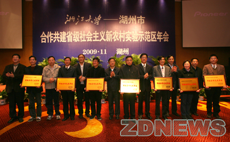 11月16日下午,在湖州市召开了浙江大学湖州市合作共建省级社会主义新农村实验示范区第三次年会,浙江大学党委书记张曦、浙江大学校长杨卫,浙江大学党委常务副书记陈子辰,常务副校长倪明江,湖州市委书记、市人大常委会主任孙文友、市委副书记、市长马以等领导出席了会议。会议上湖州市市长马以宣读了由中共湖州市委、中共浙江大学委员会、湖州市人民政府、浙江大学发文的表彰文件,“CARD”等七家单位被授予市校合作共建省级社会主义新农村实验示范区工作先进单位的光荣称号。