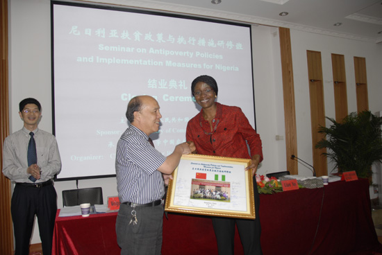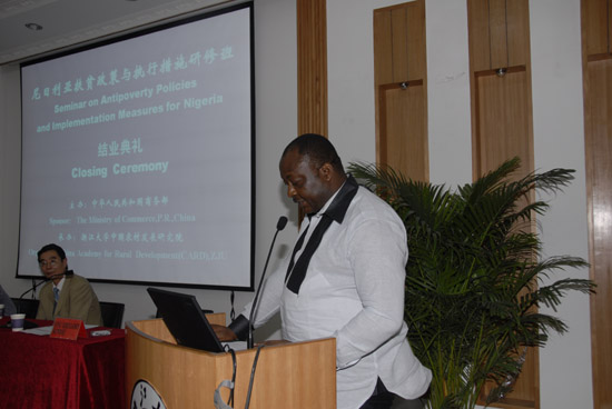 结业典礼上,徐丽安副院长代表承办方对“尼日利亚扶贫政策与执行措施研修班”做了工作总结。来自尼日利亚国家计委Onu Gregory Sunday副司长,代表全体学员做了学习总结发言。他在发言中对中国政府为尼日利亚举办“尼日利亚扶贫政策与执行措施研修班”表示衷心地感谢。 并讲到,通过研修班为期15天的课堂学习和实地参观考察,以及与国内外专家学者和中国政府官员的交流,进一步加深了他们对中国改革开放以来所取得成就和社会主义新农村建设的感性了解,并共同分享了中国反贫困经验,同时也增进了两国之间的友谊。他在发言中还高度评价浙江大学中国农村发展研究院对研修班的周到安排和热情接待。学员们诚挚地希望能与浙江大学和中国农村发展研究院保持长期联系,并希望在更多的领域开展合作。