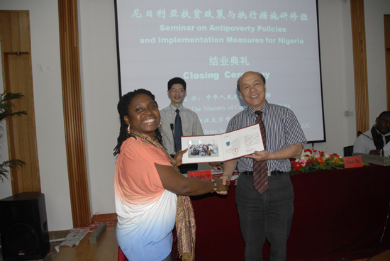 6月10日下午, 由国家商务部主办,浙江大学中国农村发展研究院(“CARD”)承办的援外项目“尼日利亚扶贫政策与执行措施研修班”圆满结业。结业典礼在浙大华家池校区CARD报告厅举行。中国农村发展研究院(CARD)黄祖辉院长, 向30位来自尼日利亚国家计委、国会委员会、总统特别助理办公室、国会参议院议长办公室及政府管理部门等的司、处级政府官员,颁发了由国家商务部印制的结业证书。