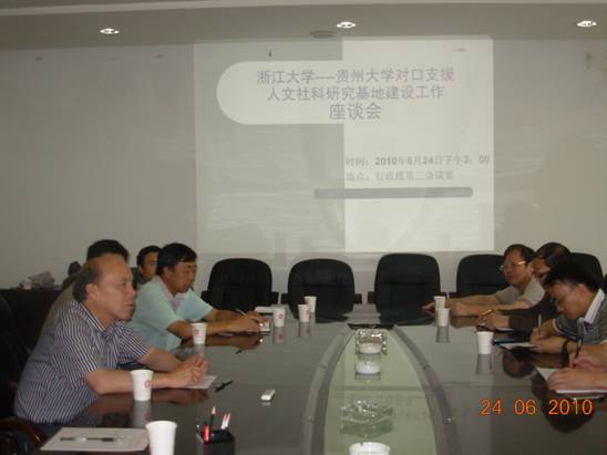 6月24日下午中国农村发展研究院黄祖辉教授和郭红东教授参加了贵州大学人文社科处举办的浙江大学--贵州大学对口支援人文社科基地建设座谈会。来自贵州大学各个学院和部门的负责人参加了会议。黄祖辉教授结合CARD十年多基地建设的做法和经验,就贵州大学如何搞好人文社科基地的申请和建设问题,提出了十分有价值的意见。参加座谈会的各个学院和部门的负责人听后觉得收获很大,对于做好基地建设很有启发。