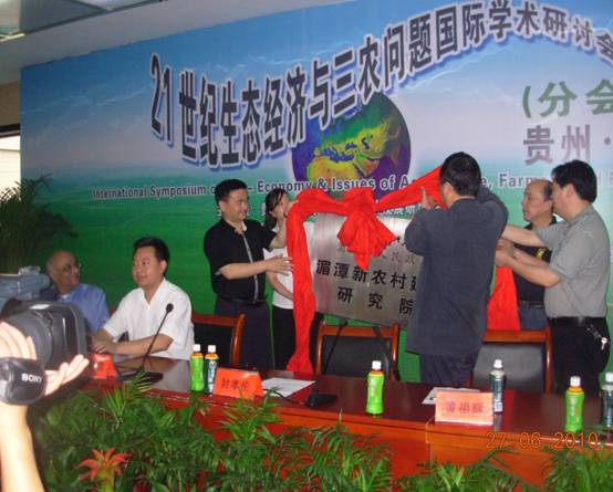 6月26日上午在湄潭县政府报告厅举行了“湄潭县新农村建设研究院”揭牌仪式。该研究院由贵州大学西南山地生态经济发展研究中心、浙江大学中国农村发展研究院(CARD)和湄潭县政府三家联合组建。湄潭县新农村建设研究院是国内首家在县级层面建立的新农村建设研究院,对于推动湄潭县新农村建设具有非常重要的意义。该研究院将依托浙江大学和贵州大学的智力优势,立足湄潭县,面向全国,进行新农村建设方面的理论与实践研究,不仅可为湄潭当地新农村建设提供决策咨询,还可以全国各地新农村建设提供有利支持。贵州大学常务副校长封孝伦教授、浙江大学中国农村发展研究院(CARD)院长黄祖辉教授和湄潭县县长肖发君签署了联合办院的协议并共同举行了揭牌仪式。