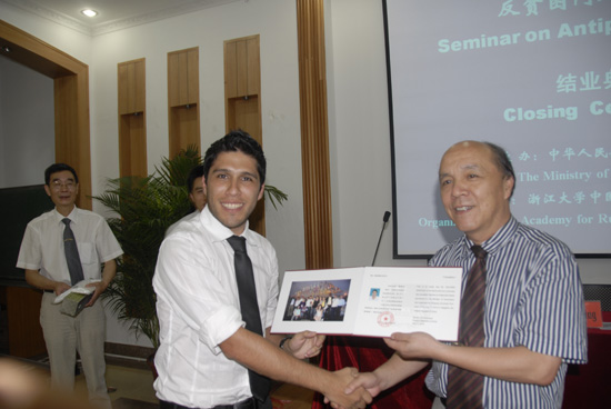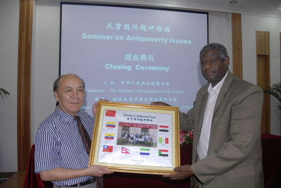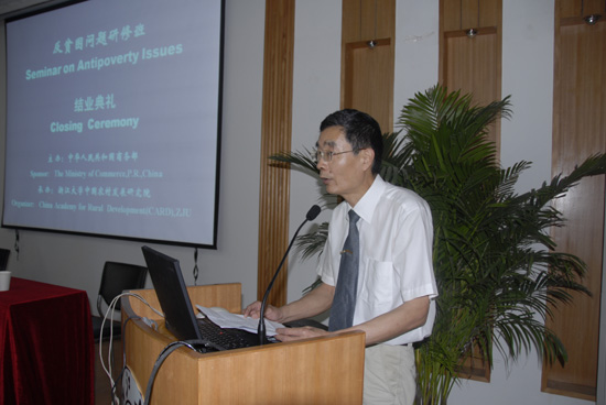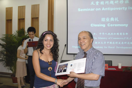 7月7日, 由国家商务部主办,浙江大学中国农村发展研究院(CARD)承办的“发展中国家反贫困问题” 高级研修班圆满结业。结业典礼在浙大华家池校区CARD报告厅举行。中国农村发展研究院(CARD)黄祖辉院长,向来自亚洲、非洲和拉美等9个发展中国家的15位政府官员, 颁发了由国家商务部印制的结业证书。