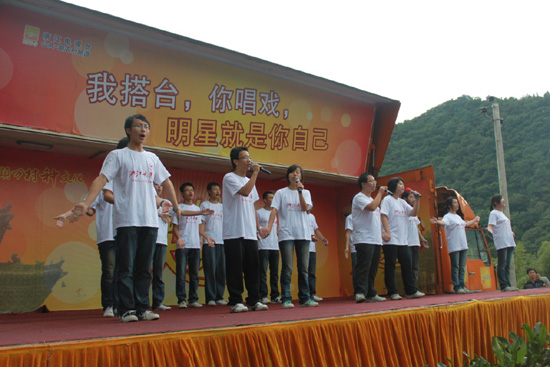 9点整,演出正式开始,此时台下已挤满了观众,附近的村名闻讯赶来,把舞台围得水泄不通。我们选送的第一个节目是二胡独奏《喜送公粮》,欢快的节奏和娴熟的技巧带领观众进入了一个美轮美奂的世界。第二个节目是独唱《上海滩》,回味经典把现场的气氛推向了高潮。第三个节目是合唱《爱,因为在心中》,优美的旋律十分动人,演员的表演更是十分精彩。