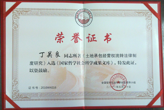 据悉,首批入选作品共有62部,是从489项申报成果中,经过专家评审和社会公示等程序层层遴选确定的。CARD丁关良教授的专著《 土地承包经营权流转法律制度研究》成功入选该成果文库,为浙江大学首部入选成果。该专著从土地承包经营权法理分析和土地承包经营权流转的法律基础、运行现状、典型案例、存在问题及国外农地流转制度研究着手,结合民法理论和《中共中央关于推进农村改革发展若干重大问题的决定》之“抓紧完善相关法律法规和配套政策”精神,提出了土地承包经营权流转法律制度改革和完整构想,重点研究了土地承包经营权流转的内涵和特征,流转方式的种类和分类,流转的基本原则和各类流转的具体原则,物权性、债权性、股权性和行政性等四类流转的各种方式运行机制,各类流转的法律保护方法,并提出了实现土地承包经营权依法流转的内部和外部条件。
