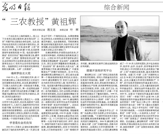一个出生在大上海的城里人,因上山下乡来到北国边陲农村,原本陌生的“三农”问题开始占据他生命的空间。从此,他开始站在农民的立场思索中国的农业、农村、农民问题。33年来,他发表“三农”研究论文200多篇,专(译)著10部,先后获得国家和省部级奖励10项。他在国内最早提出“农民市民化”概念和政策主张,最早在“两会”上提出“暂停征收农业税”建议,还在理论和立法层面,推动浙江省在全国率先出台《农民专业合作经济组织条例》。他就是浙江大学中国农村发展研究院院长黄祖辉。人称“三农教授”。