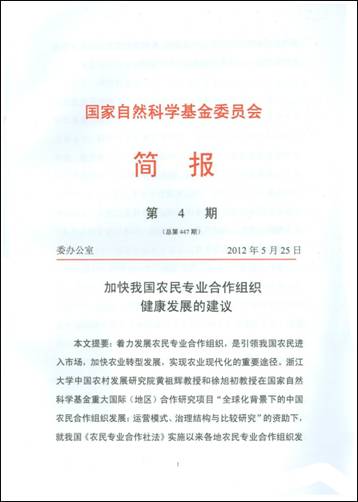 简报指出:“着力发展农民专业合作组织,是引领我国农民进入市场,加快农业转型发展,实现农业现代化的重要途径。浙江大学中国农村发展研究院黄祖辉教授和徐旭初教授在国家自然科学基金重大国际(地区)合作研究项目“全球化背景下中国农民合作组织发展:运营模式、治理结构与比较研究”的资助下,就我国《农民专业合作社法》实施以来各地农民专业组织发展的成效和存在问题进行分析总结,并对新时期我国农民专业合作组织的进一步发展问题提出了若干重要建议。”