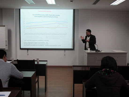 在报告中,惠建国博士主要介绍当前美国经济发展状况,并对美国货币政策和财政政策等相关问题进行了讨论。报告中,惠建国博士通过大量详细的宏观经济数据和直观的统计分析图表,阐述了近年来美国经济及相关政策。首先,惠建国博士介绍了美国近十年来的经济发展路径和趋势,对GDP、可支配收入、消费者信心和失业率等经济现象进行了解读,并提出了自己的思考;其次,详细介绍了美国房地产业、制造业、进出口等方面的情况,并对美国的经济基础——宏观经济政策的货币政策和财政政策、债务问题和预算赤字进行了分析。最后惠建国博士进一步与大家分享了他对美国和中国经济相互关系的思考,提出了他对中国当前经济“国进民退”状况的忧虑以及未来的改革方向,认为我们国家的宏观经济政策的基础应该是“国不以利为利,以义为利”。