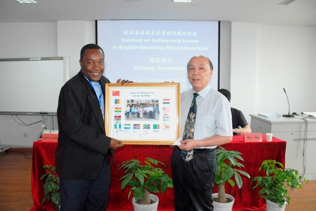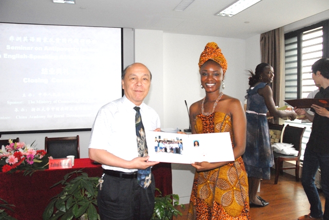 结业典礼上,中国农村发展研究院徐丽安副院长代表承办方对非洲英语国家“反贫困问题高级研修项目”做了工作总结。来自加纳的政府官员赛切芮女士, 代表全体学员做了学习总结发言。她首先代表全体学员对中国政府为他们提供这么宝贵的研修机会表示最衷心的感谢。其次,她表示了在研修过程中学员们对研修项目安排、课程设置以及授课老师的水平都非常满意,甚至超出了他们的预期,并高度评价授课专家教授的学识渊博。此外,赛切芮女士认为通过对浙江义乌、上海、四川蒲江等地的考察活动,他们收获颇多,对各自国家的反贫困都很有启发,对中国改革开放所取得成就有了全新和具体的认识,希望能够借鉴中国反贫困的成功经验,使非洲国家早日摆脱贫困。此外,她代表全体学员对浙江大学CARD杰出的组织管理工作表示衷心地感谢。最后,她深情地说道:在研修班结束之际,我们将回到各自的国家,我们将在各自国家扮演中国大使的身份,宣传中国的反贫困经验,并骄傲的告诉别人,我们是中国的朋友。