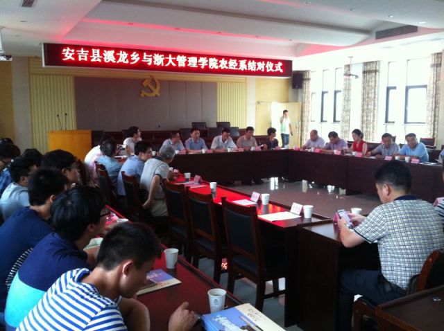 7月10日下午,管理学院党委“争锋行动”之农经系党支部与安吉县溪龙乡结对仪式在溪龙乡政府会议室举行。安吉县委常委、组织部长朱德清,溪龙乡党委书记孙莉、乡长姚志峰等县乡领导出席仪式并讲话,管理学院党委副书记阮俊华代表学院党委出席仪式并讲话。溪龙乡党委书记孙莉和农经系支部书记郭红东教授在合作协议上签了字。根据协议浙江大学农经系将发挥人才与知识的优势,为溪龙乡美丽乡村和白茶产业发展提供智力支持,溪龙乡将为农经系学生教学实习、老师科研等提供支持。出席仪式的还有溪龙乡各村党支部书记,管理学院农经系党支部成员,部分教师、学生。仪式上双方签订了合作协议。通过结对子活动,促进了校地合作,对溪龙乡农业产业发展,对管理学院农经学科建设、人才培养都具有积极意义。仪式结束,双方进行了深层次的对接座谈。