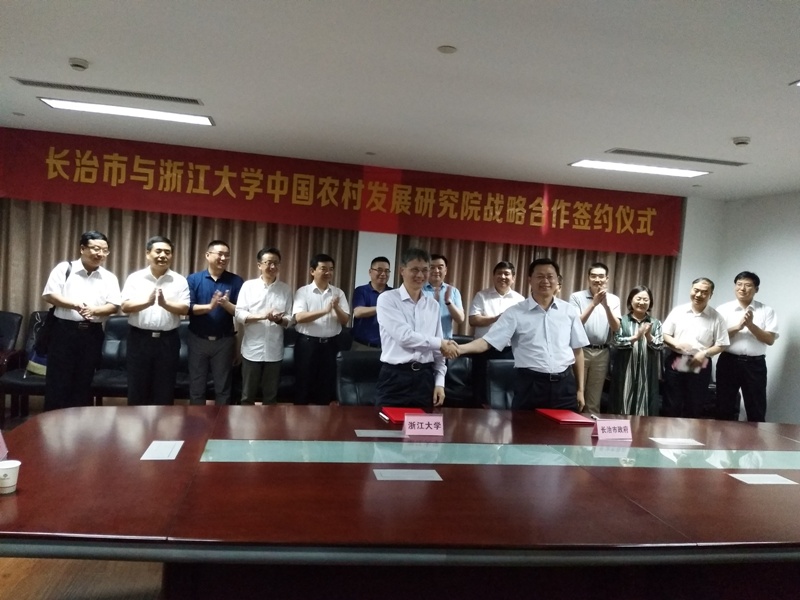 为贯彻落实“省校合作”精神,长治市人民政府与浙江大学中国农村发展研究院决定共同携手,在农业农村发展方面展开紧密合作。6月14日下午,在浙江大学紫金港校区启真大厦举办了战略合作签约仪式,长治市委书记席小军、市委常委/常务副市长潘贤掌、市委常委/平顺县委书记吴小华、长治市副市长张和平、市高新区管委会主任张圣、长治县委书记裴少飞、浙江大学中国农村发展研究院副院长钱文荣、著名三农研究专家顾益康、浙江大学农村发展研究院副院长郭红东、浙江大学CARD中国农业合作组织研究中心主任徐旭初、农民日报浙江站站长/浙江大学CARD中国农业品牌研究中心特聘研究员蒋文龙、浙江大学智慧农业创新发展研究中心主任张洪、杜英森等出席了本次战略合作签约仪式。