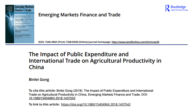 近日,中国农村发展研究院龚斌磊研究员独著论文“The Impact of Public Expenditure and International Trade on Agricultural Productivity in China”(财政支出和国际贸易对中国农业生产率的影响)被知名SSCI学术期刊《新兴市场金融与贸易》(Emerging Markets Finance and Trade, EMFT)录用。