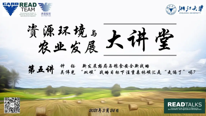 2021年5月24日,“求是智库”系列讲座:浙大卡特三农学术论坛之179期暨资源环境与农业发展大讲堂(READ TALKS)第五讲成功举办。中国农业科学院研究员、农业经济与发展研究所产业经济研究室主任、粮食安全与发展政策创新团队首席专家钟钰受邀作题为《新发展格局与粮食安全新战略》的学术讲座。浙大卡特READ团队对讲座内容进行整理,以飨读者。