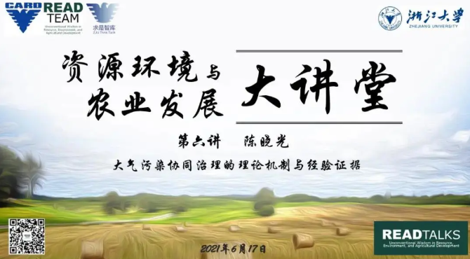 2021年6月17日,“求是智库”系列讲座:浙大卡特三农学术论坛之182期暨资源环境与农业发展大讲堂(READ TALK)第6讲因故推迟至晚上举行,本期主讲人,西南财经大学“光华杰出学者计划”特聘教授、国家优青获得者陈晓光受邀作了题为《同一片蓝天:大气污染协同治理的理论机制与经验证据》的报告。浙大卡特READ团队将陈晓光教授的报告内容进行整理,以飨读者。