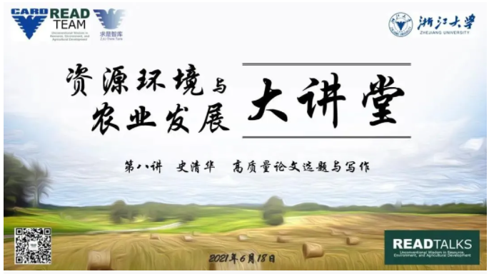 2021年6月18日,“求是智库”系列讲座:浙大卡特三农学术论坛之184期暨资源环境与农业发展大讲堂(READ TALK)第8讲成功举办。上海交通大学特聘教授、安泰经济与管理学院史清华教授受邀作题为《高质量论文的写作技巧》的讲座,线上线下共计三百余人聆听了讲座。浙大READ团队对讲座内容进行整理,以飨读者。
