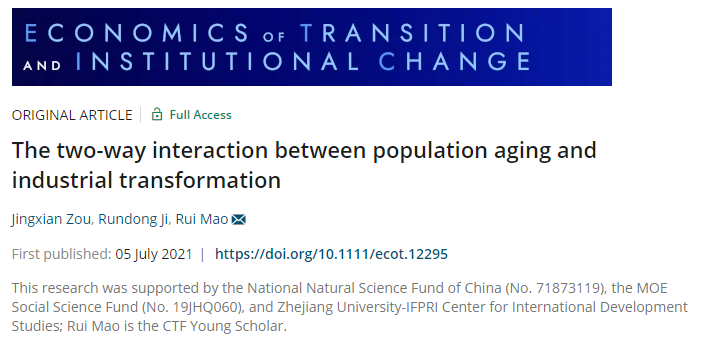 浙江大学中国农村发展研究院茅锐教授与中国人民大学邹静娴、北京大学吉润东合作的论文“人口老龄化与产业转型的交互影响(The two-way interaction between population aging and industrial transformation)”,近日在经济转型领域国际期刊《转型经济学(Economics of Transition and Institutional Change)》上发表。