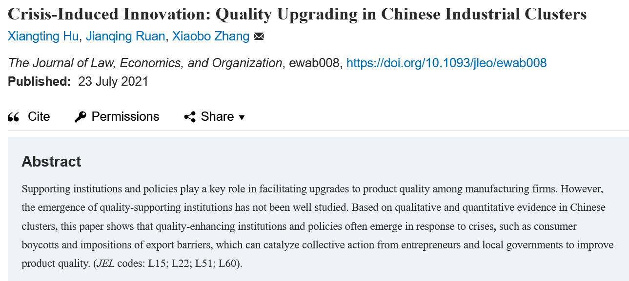 近日,浙江大学中国农村发展研究院、公共管理学院阮建青教授,作为共同一作,与哈工大深圳校区胡向婷副教授、北京大学张晓波教授合作撰写的论文“Crisis-Induced Innovation: Quality Upgrading in Chinese Industrial Clusters”,发表在牛津大学出版社出版的法、经济与组织行为交叉学科权威期刊The Journal of Law, Economics, and Organization上。