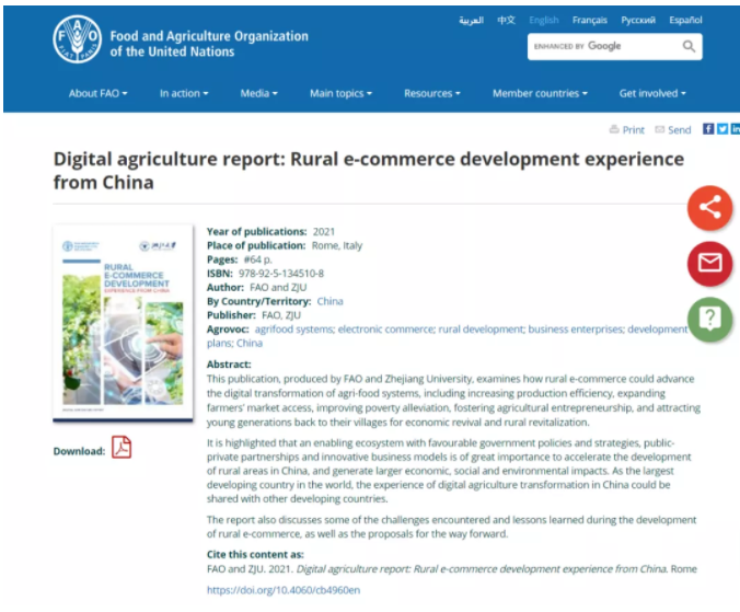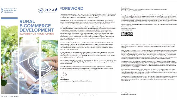 近日,浙江大学食物经济与农商管理研究所卫龙宝教授团队携手联合国粮食与农业组织(粮农组织,FAO)合作伙伴撰写的《数字农业报告:中国农村电商的发展经验》正式出版并向全球公开发行。本报告是浙江大学与粮农组织自2019年12月签署谅解备忘录以来成功开展系列合作的标志性成果之一,其目的是进一步推动国际社会针对农业和农村发展电子商务展开更加深入的讨论,以实现粮农组织所倡导的“改进方式、方法和解决办法,加快农村社区的包容性和可持续发展,以实现更好的生产、更好的营养、更好的环境和更好的生活,不让任何地区掉队”发展目标。