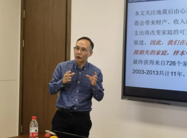接下来阮老师介绍了自然灾害冲击对农村社会资本投资的影响。社会资本积累的差异是个体或群体长期资源财富差距的重要来源。在共同富裕背景下,理解日益频繁的灾害冲击对农村家庭社会资本积累的影响及其机理有重要现实意义,尤其是当这种影响的来源并非物质损失,而是长期的心理改变时。该项研究结合农村固定观察点数据与一份关于汶川地震的补充调查数据,实现了心理影响的分离,并利用双重差分法检验了汶川地震对农村家庭社会资本投资的影响。结果表明,第一,地震使农户社会资本投资显著减少;第二,灾后物质消费的放任挤出了农户的社会资本投资;第三,地震对农村家庭社会资本投资的影响具有烙印性,即使消费与储蓄情况恢复到震前水平,社会资本投资依然保持走低的惯性。研究拓展了灾害的心理影响和社会资本供给层面的文献,对于理解家庭资源差异,洞悉灾害更深层次的心理烙印有一定的启示意义。