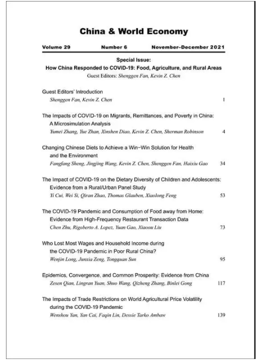 特刊收录“The Impacts of COVID-19 on Migrants, Remittances, and Poverty in China: A Microsimulation Analysis”、“Changing Chinese Diets to Achieve a Win−Win Solution for Health and the Environment”等七篇文章,讨论了新冠疫情对农民工收入、健康膳食、农产品价格等问题的影响。