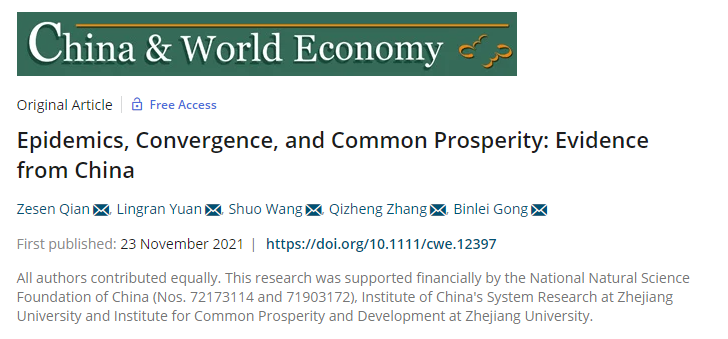 近日,READ团队钱泽森(第一作者)、袁菱苒、王硕、张启正、龚斌磊(通讯作者)撰写的论文“Epidemics, Convergence and Common Prosperity: Evidence from China(传染病、收敛与共同富裕)”发表于经济学SSCI期刊China & World Economy(《中国与世界经济》)。
