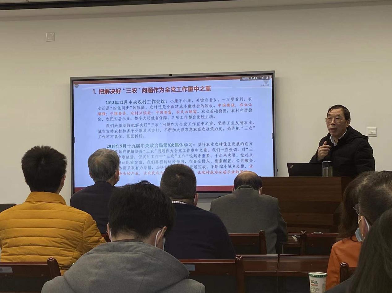 本次会议邀请了“卡特”副院长张忠根教授作了《习总书记关于“三农”工作重要论述》的辅导报告。张忠根教授指出:党的十八大以来,以习近平同志为核心的党中央把解决好“三农”问题作为全党工作的重中之重,打赢脱贫攻坚战,启动实施乡村振兴战略,推动农业农村取得历史性成就、发生历史性变革。中国特色社会主义己进入了新时代。习近平总书记关于“三农”工作的重要论述,对于做好新时代“三农”工作,促进农业高质高效、乡村宜居宜业、农民富裕富足,书写中华民族伟大复兴的“三农”新篇章,具有十分重要的指导意义,对于做好“三农”教学和研究工作也有重要指导意义。