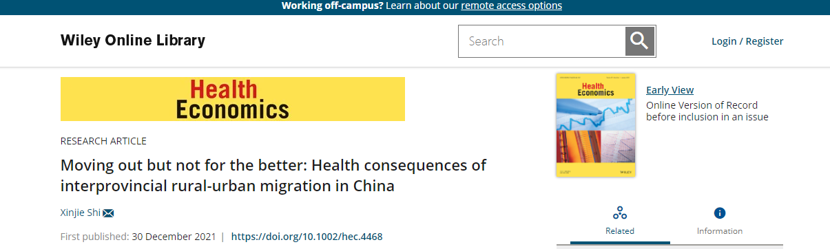 近日,浙江大学中国农村发展研究院史新杰研究员独立撰写的论文"Moving out but not for the better: Health consequences of interprovincial rural-urban migration in China"被健康经济学权威期刊Health Economics录用并在线发表。