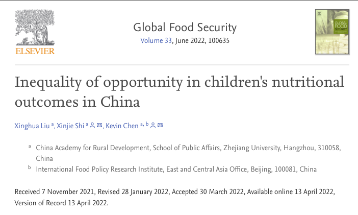 近日,浙江大学中国农村发展研究院陈志钢教授与刘星华博士后、史新杰研究员合作论文——Inequality of opportunity in children’s nutritional outcomes in China在全球食物安全领域著名期刊Global Food Security在线发表。Global Food Security为SCI一区期刊,最新影响因子为7.772,在FOOD SCIENCE & TECHNOLOGY大类中排名为6/143。