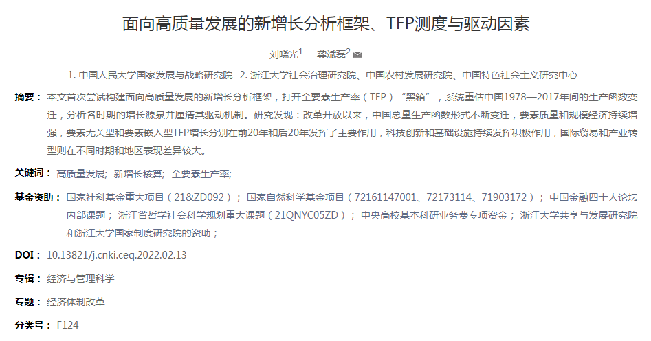 近日,浙江大学中国农村发展研究院龚斌磊研究员与中国人民大学国家发展与战略研究院刘晓光副教授合作撰写的《面向高质量发展的新增长分析框架、TFP测度与驱动因素》发表于《经济学(季刊)》2022年第二期。