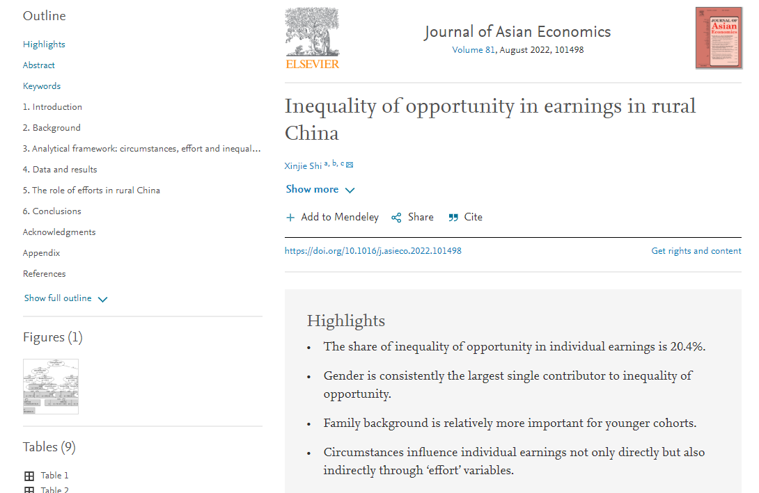 近日,浙江大学中国农村发展研究院史新杰研究员独立撰写的论文——Inequality of opportunity in earnings in rural China,被Journal of Asian Economics录用并在线发表。Journal of Asian Economics是爱思唯尔(Elsevier)旗下亚洲经济研究知名期刊。