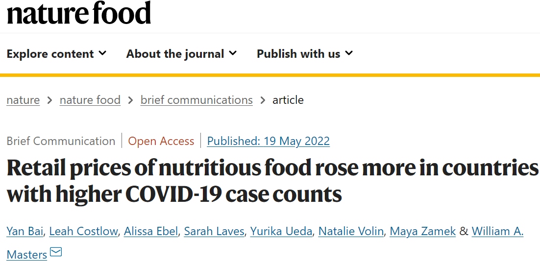 Bai, Y., Costlow, L., Ebel, A. et al. Retail prices of nutritious food rose more in countries with higher COVID-19 case counts. Nat Food 3, 325–330 (2022).