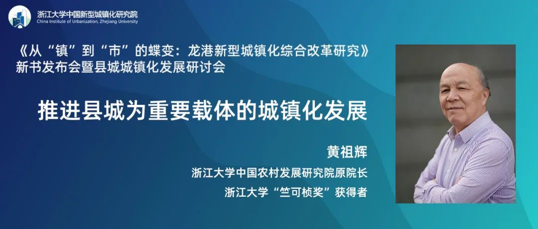 2022年8月17日,由浙江大学中国新型城镇化研究院举办的《从“镇”到“市”的蝶变:龙港新型城镇化综合改革研究》新书发布会暨“县城城镇化发展研讨会”在杭州市成功举办。会上,浙江大学中国农村发展研究院原院长、浙江大学“竺可桢奖”获得者黄祖辉教授发表了题为“推进县城为重要载体的城镇化发展”的主旨演讲。