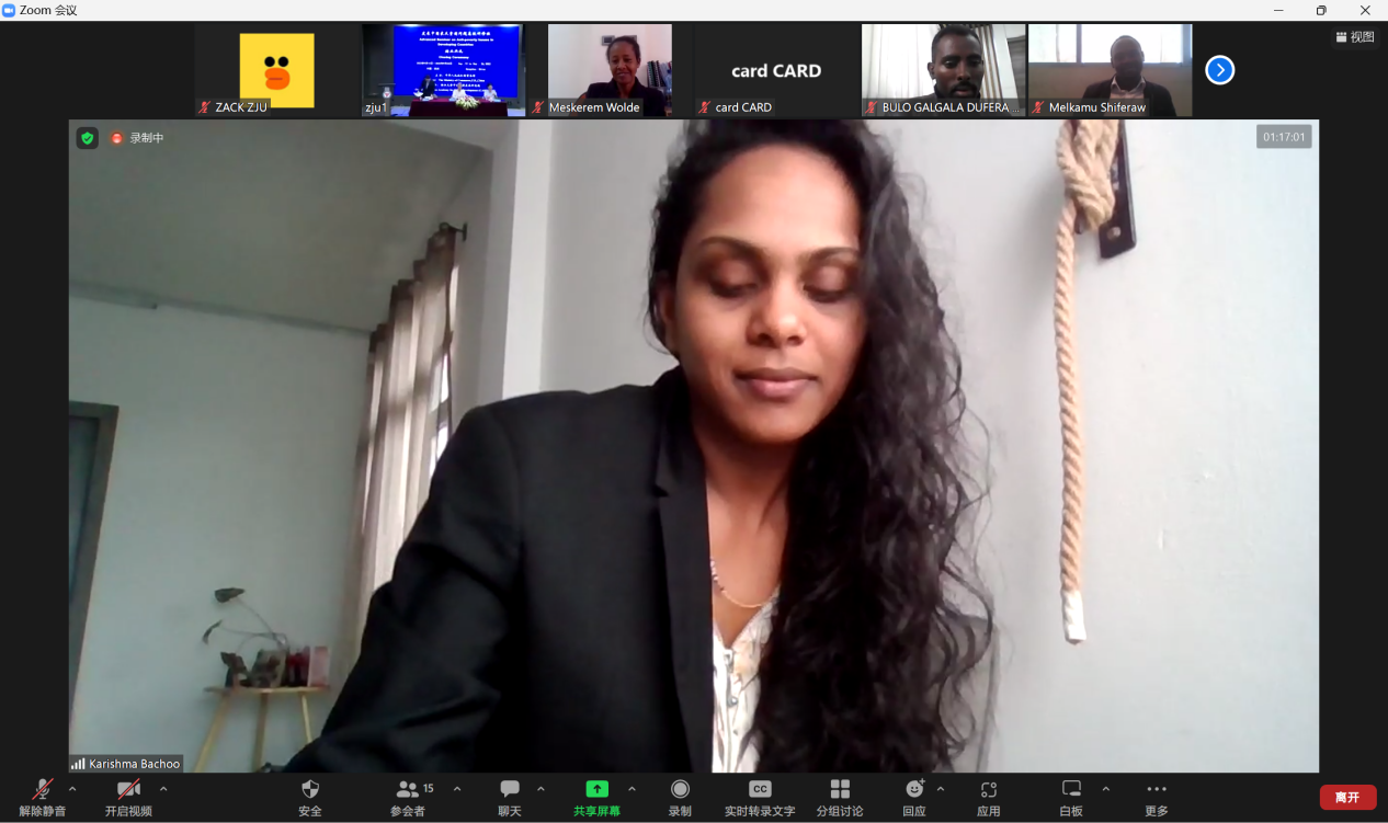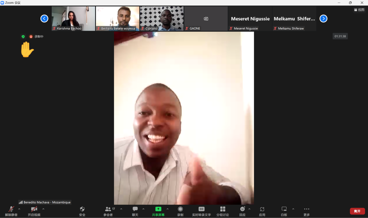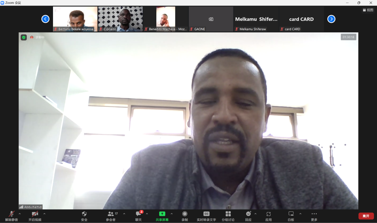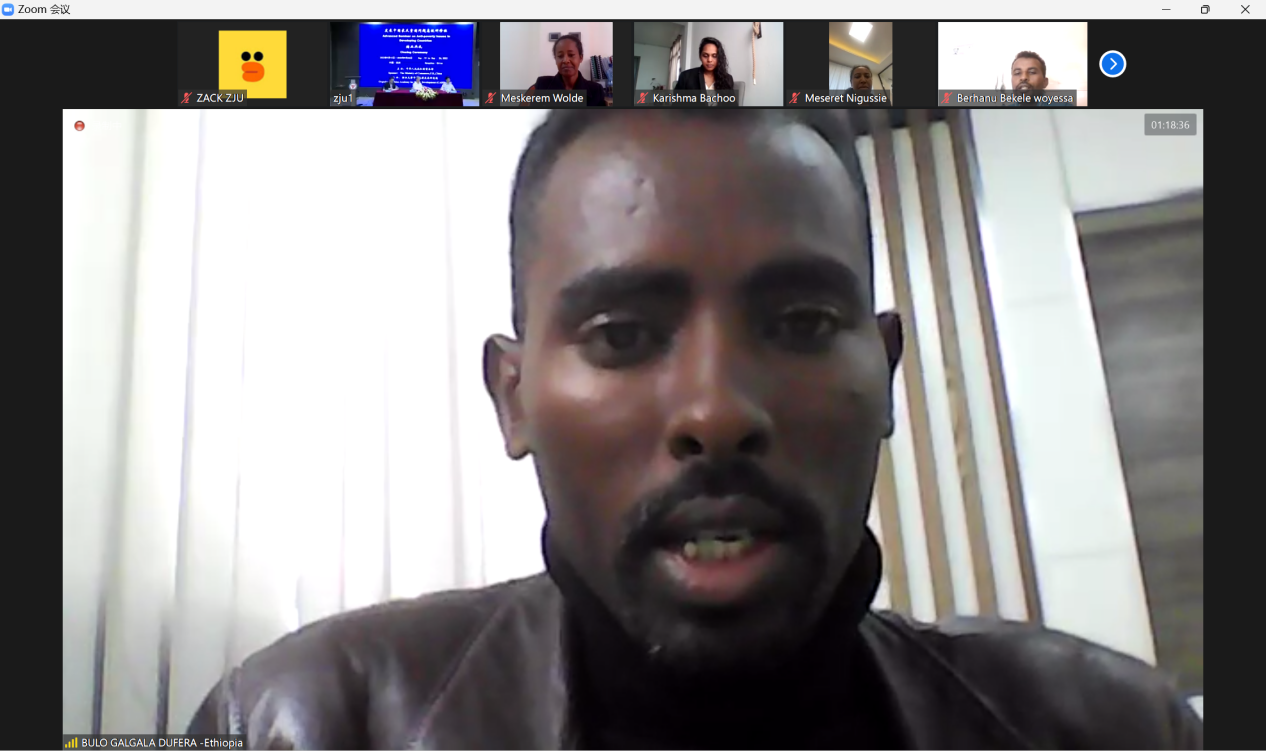 随后,茅锐教授向学员们在线颁发了由国家商务部印制的结业证书。在场的领导、嘉宾和线上学员们纷纷鼓掌表示祝贺。学员阿卜杜拉瓦哈卜·穆罕默德·阿卜杜拉米德(ABULHAMID ABDULWAHAB MOHAMMED)、玛加瓦·贝纳迪托·亚德热克(BERENEDITO XADREQUE MACHAVA)、贝克勒·沃耶萨·贝拉努 (BERHANU BEKELE WOYESSA) 获得证书后,依次补充发言,他们都表达了对卡特教师团队的感谢,对援外课程的肯定,及希望未来能来中国交流学习。
