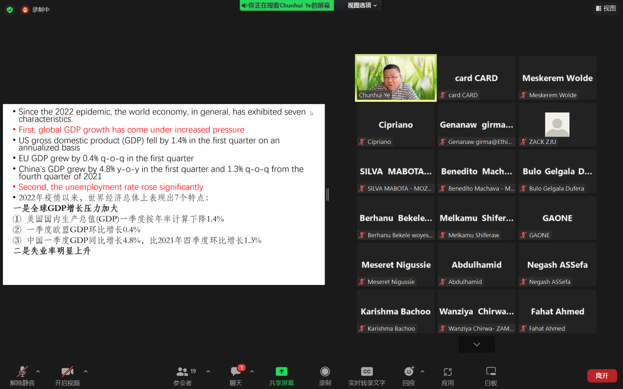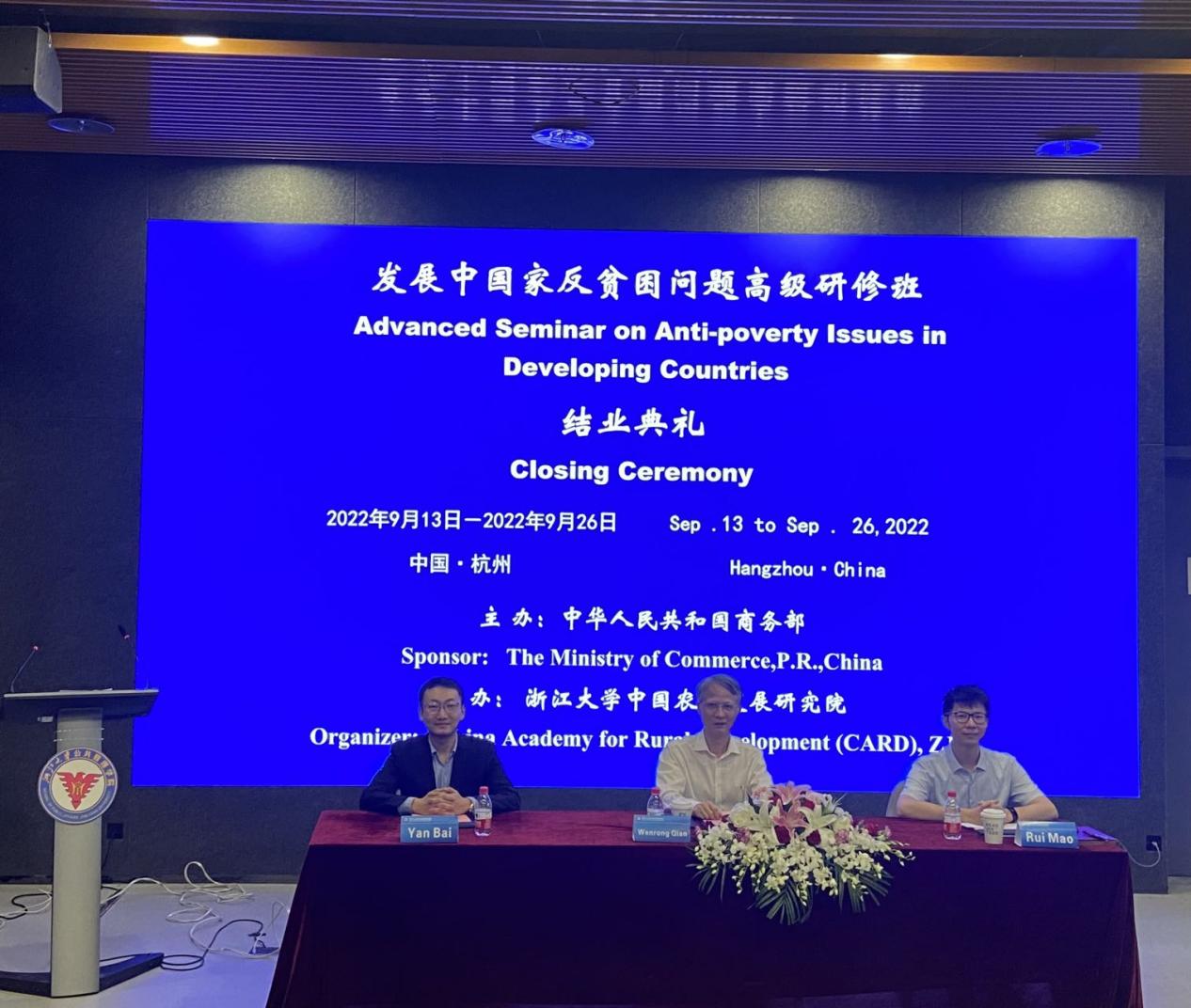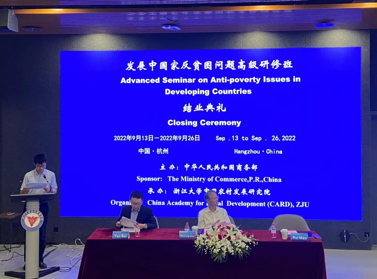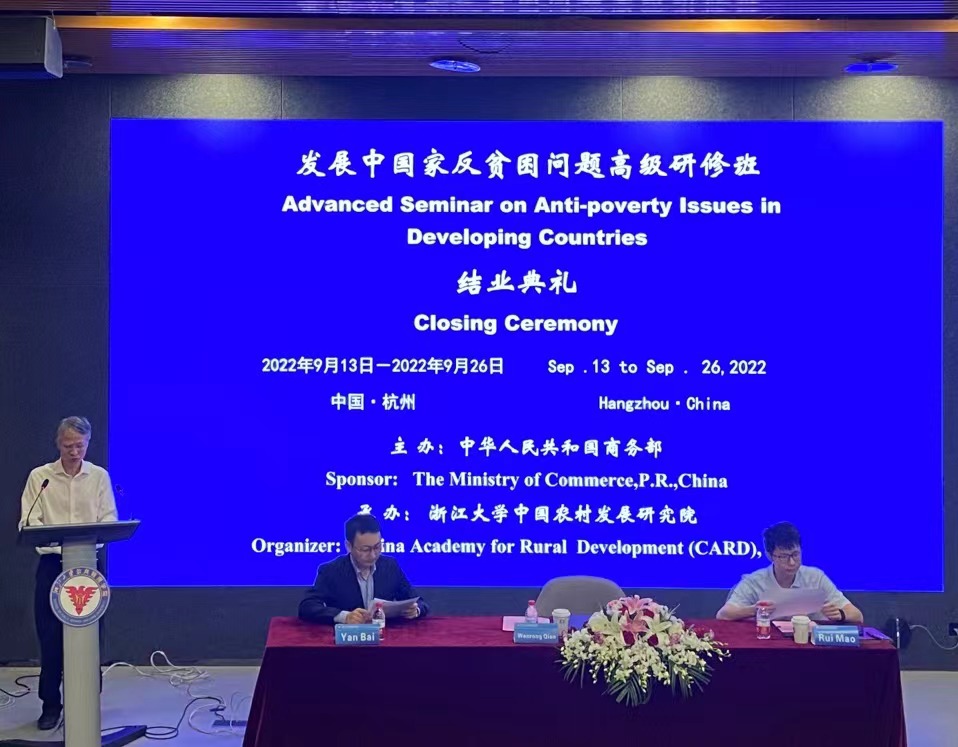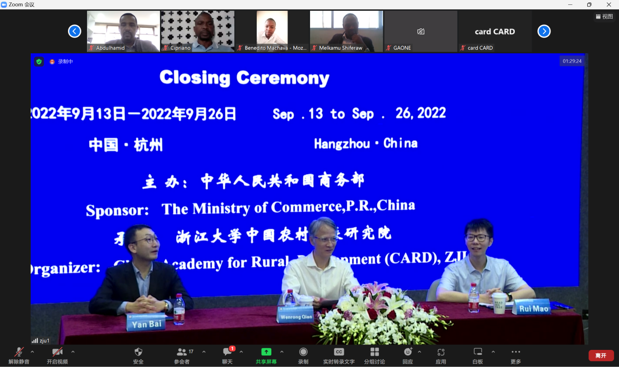 2022年9月26日下午, 由国家商务部主办、浙江大学中国农村发展研究院(浙大“卡特”)承办,为期14天的“2022年发展中国家反贫困问题高级研修班”圆满落幕。结业典礼在浙江大学公共管理学院报告厅举行,来自埃塞俄比亚、博茨瓦纳、毛里求斯、莫桑比克、肯尼亚、赞比亚6个发展中国家的22位司处级官员圆满完成线上研修任务,顺利结业。