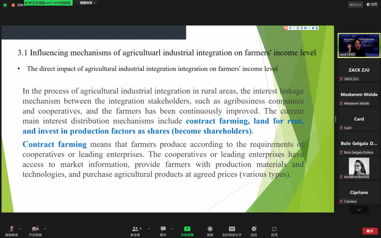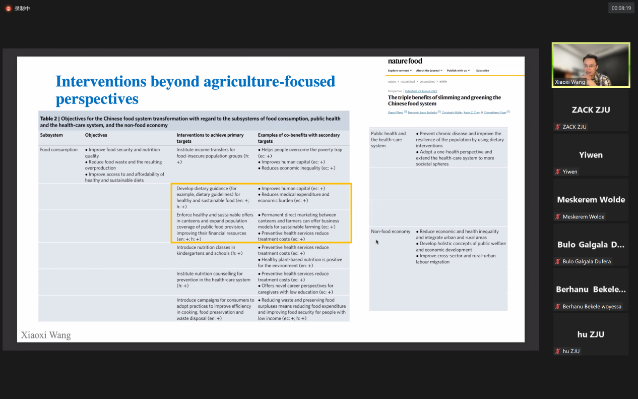 研修班期间,学员们听取了中国国情课:中国国际抗疫合作(由浙江大学医学院附属第一医院苏俊威主治医师授课)、中国国情概况;专题讲座和研讨交流课:包容性农业:通往“零饥饿”之路、中国渐进式农村改革与城乡融合发展、中国食品产业转型的驱动与效应、中国数字经济与可持续农业发展:模式与经验、中国农业产业组织和农村合作社发展、中国乡村电子商务发展、中国农村扶贫开发模式:以浙江地方特色产业发展为例、乡村产业发展促进农户增收的路径与机制、中国的贫困、不平等与发展、发展中国家农业、贫困与可持续发展内容的汇报与分享等。通过在线视频内容学习,和老师们交流研讨,学员们感受和学习了中国在创新创业、乡村电子商务、农村产业融合发展、中小企业及电商发展、美丽新农村建设等方面的做法和经验,收获颇丰。
