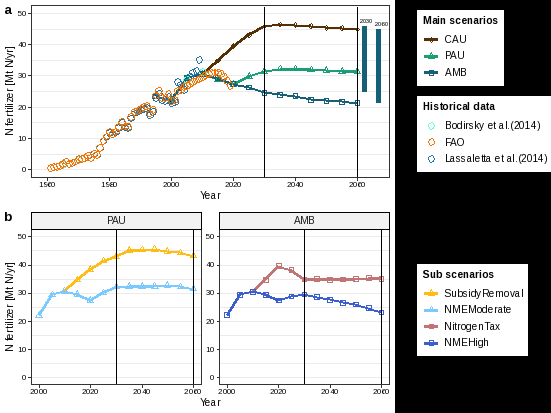 图1 主情景(a)和子情景(b)下的中国氮肥施用量