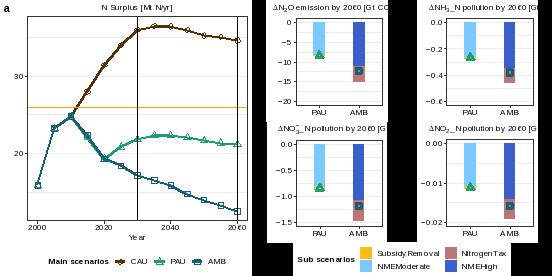 本研究基于汪笑溪团队开发的MAgPIE-China模型,与计量经济模型进行耦合,评估了中国化肥政策改革(包括化肥零增长政策、取消化肥生产补贴政策以及更具雄心的氮税和碳税措施)对化肥施用量、氮污染排放以及粮食安全的影响。本研究也是目前运用MAgPIE(Model of Agricultural Production and its Impact on the Environment)综合评估模型, 研究与分析中国问题的首篇文章。