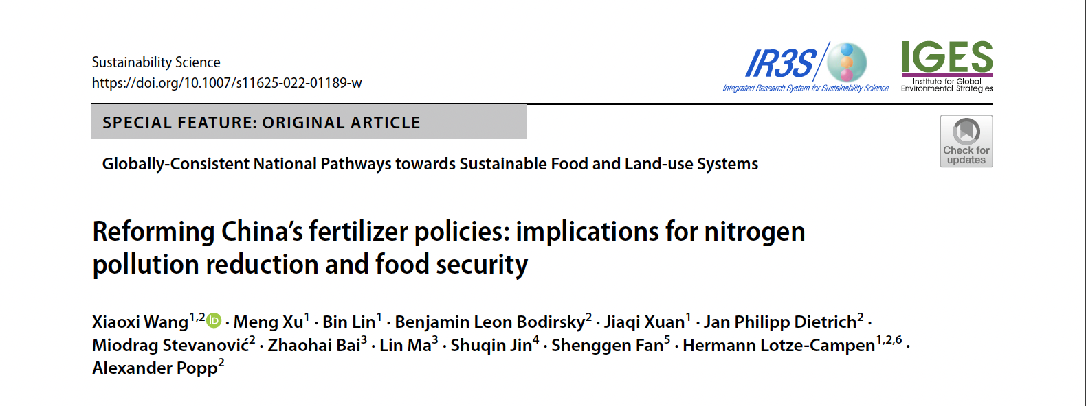 近期,浙江大学中国农村发展研究院汪笑溪研究员团队与波茨坦气候影响研究所(PIK)、中科院遗传所、农业农村部经济研究中心、中国农业大学、柏林洪堡大学、食物系统经济委员会(FSEC)等相关团队合作的论文“Reforming China’s fertilizer policies: implications for nitrogen pollution reduction and food security”在Sustainability Science在线发表。Sustainability Science是SCI一区期刊,5年影响因子为7.934。