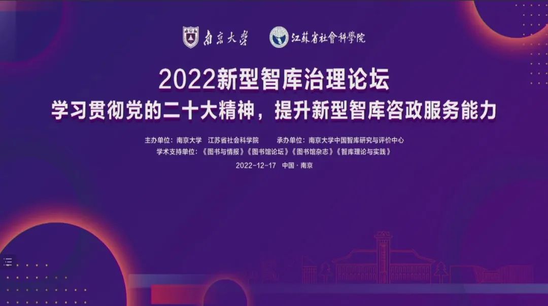 2022年12月17日,“2022新型智库治理论坛”在江苏省南京市举行。全国各省市思想理论和智库管理部门领导、高校科研管理部门领导、中国智库索引(CTTI)来源智库、智库研究界著名专家学者及媒体记者共700余人参会。会议主要围绕“学习贯彻党的二十大精神,提升新型智库咨政服务能力”主题。浙江大学卡特院长钱文荣教授、院长助理胡伟斌智库研究员参加会议。