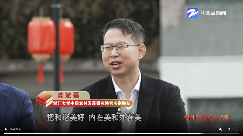 2022年12月21日,浙江大学中国农村发展研究院常务副院长龚斌磊教授做客浙江卫视电视理论节目“中国共产党为什么能”第十九季《二十大精神面对面》第三集《让农村更令人向往》,走进磐安县悬崖村,就“全面推进乡村振兴的重要意义”、“异地扶贫搬迁”、“基础设施和公共服务布局”、“悬崖村的特色发展”、“深化土地制度改革”、“和美乡村”、“集体经济”等问题,与村民、驻村干部、青年代表共话乡村振兴。据悉,浙江卫视推出的电视理论专栏节目《中国共产党为什么能》,宣传党的主张,阐释党的创新理论,引导广大党员干部深刻领会习近平新时代中国特色社会主义思想的核心要义和精神实质。2022年3月,该节目被国家广播电视总局列入2022年广播电视重点节目名单,属于“领航新时代”主题。