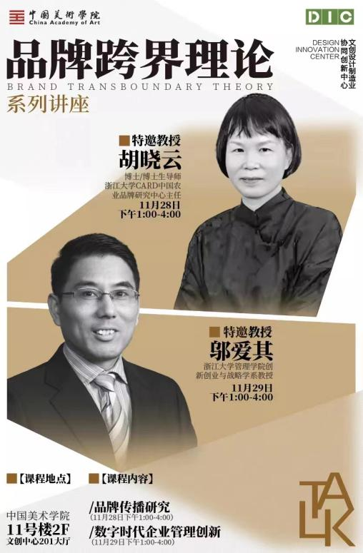 应邀在中国美术学院开讲“品牌跨界理论”系列讲座第一讲,作题为《品牌创造:从差异化符号到差异化价值》的学术讲座,从品牌创造的时代背景、起源与本质以及品牌创造实践等三个板块与师生进行了互动分享。