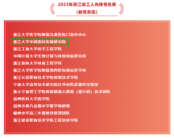 其中,浙江大学中国农村发展研究院荣获“浙江省工人先锋号”荣誉称号。