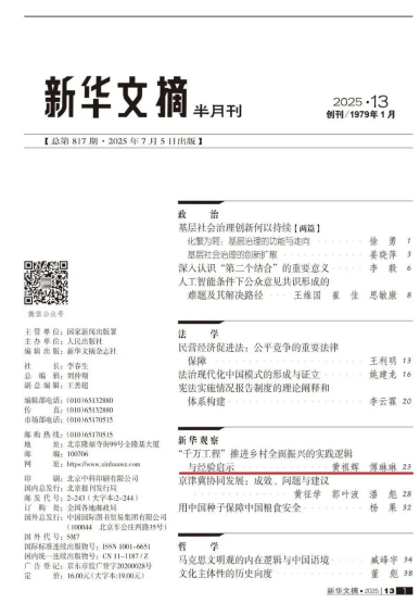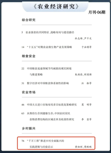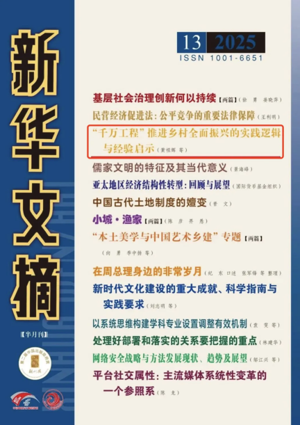 近日,《改革》2025年第2期首发的《“千万工程”推进乡村全面振兴的实践逻辑与经验启示》被《新华文摘》2025年第13期转载并列为封面文章,同时也被人大复印资料《农业经济研究》2025年第6期全文转载。该文为浙江大学公共管理学院博士生导师、浙江大学中国农村发展研究院首席专家黄祖辉、浙江省农业科学院农村发展研究所副研究员傅琳琳合作撰写。