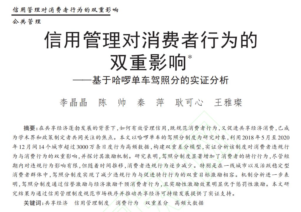 近日,浙江大学中国农村发展研究院陈帅教授与北京交通大学王雅璨、李晶晶、耿可心,以及中国人民大学秦萍的合作论文“信用管理对消费者行为的双重影响——基于哈啰单车驾照分的实证分析”在《管理世界》发表。论文探讨了通过信用管理制度设计来规范市场秩序背后的信誉激励和经济激励机制,从而回应了推动共享经济可持续发展的政策设计问题。