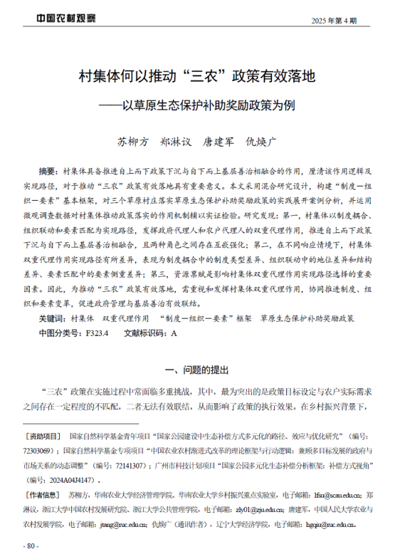 文献来源:苏柳方,郑淋议,唐建军,仇焕广. 村集体何以推动“三农”政策有效落地:以草原生态奖补政策为例[J]. 中国农村观察, 2025, (04): 80-100.
