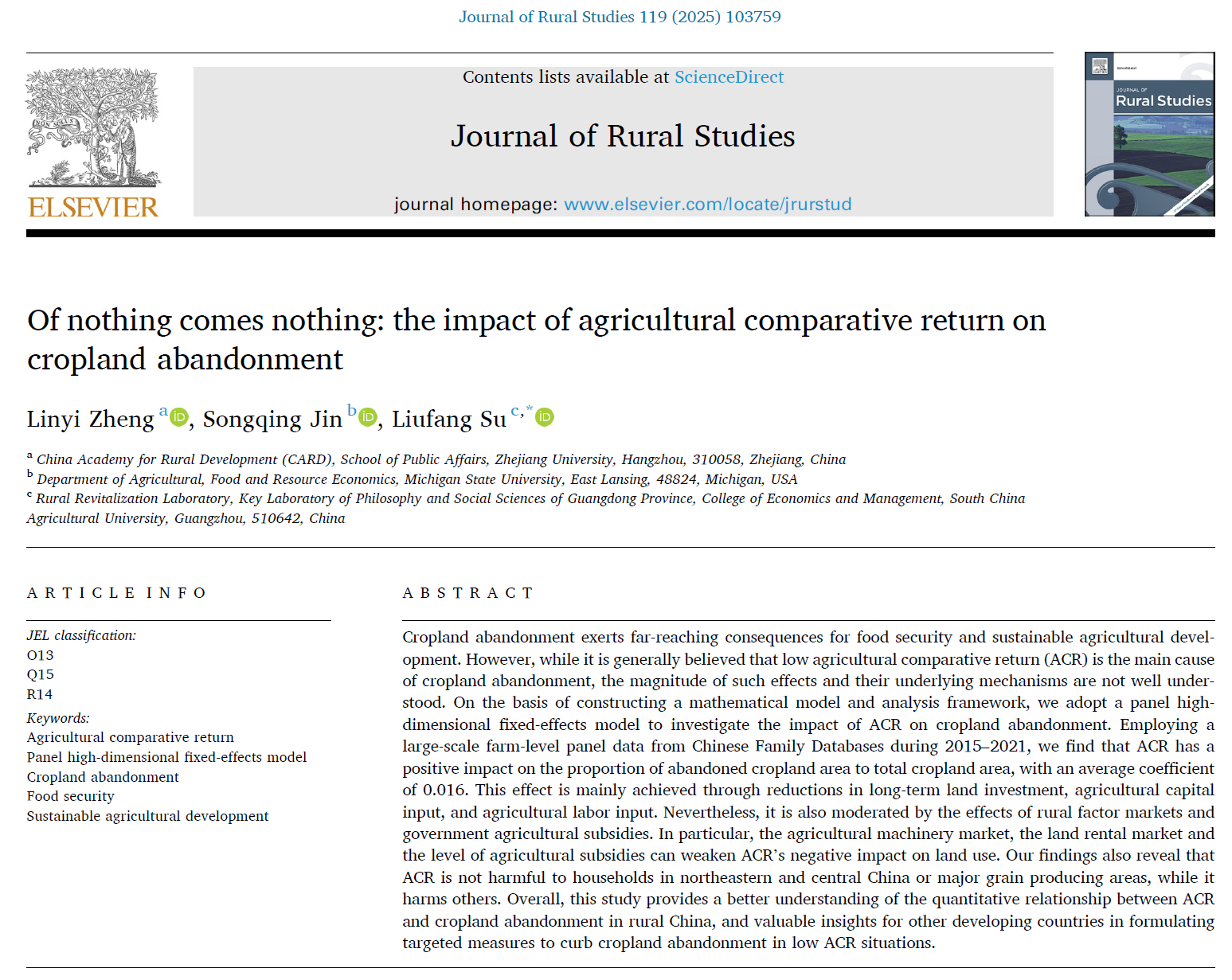 近日,浙江大学中国农村发展研究院副研究员郑淋议与密歇根州立大学金松青教授、中国人民大学与辽宁大学仇焕广教授团队、华南农业大学副教授苏柳方以及浙江农林大学讲师钱泽森、浙江省委党校教师洪甘霖等的合作论文先后在农村发展研究领域权威期刊Journal of Rural Studies和国内“农经四大刊”之《中国农村观察》《农业经济问题》发表。