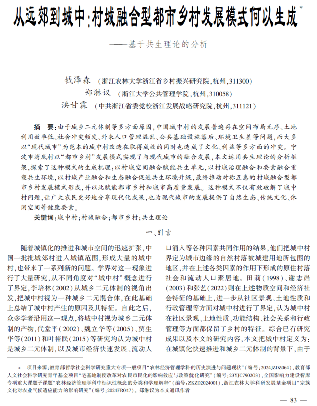 资料来源:钱泽森,郑淋议,洪甘霖. 从远郊到城中:村城融合型都市乡村发展模式何以生成——基于共生理论的案例分析[J]. 农业经济问题, 2025, (05): 83-93.