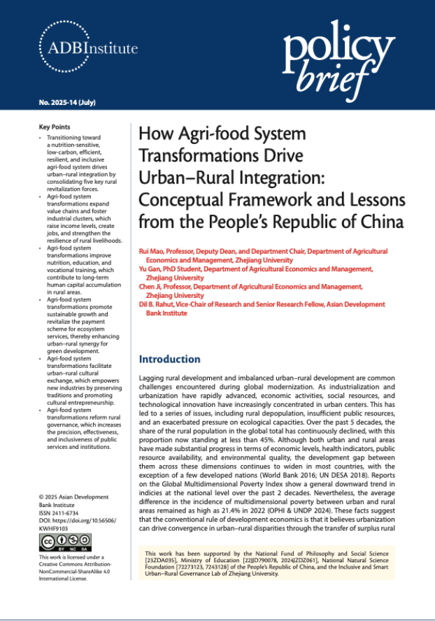 茅锐和季晨教授、卡特博士生甘雨还与ADBI研究团队共同撰写了“农食系统转型推动城乡融合发展:理念框架与中国经验”的文章,作为亚行研究院政策简报(ADBI Policy Brief)2025-14期发表(https://www.adb.org/publications/how-agri-food-system-transformations-drive-urban-rural-integration-conceptual-framework-and-lessons-from-the-people-s-republic-of-china)。文章展现了浙江大学哲学社会科学自主知识体系创新团队及浙江大学作为总召集人单位承担教育部中国特色哲学社会科学研究重大专项以来,在构建中国农林经济管理学自主知识体系方面的理论与实践研究成果。同时,文章也系统介绍了卡特团队在自主知识体系丛书案例系列撰写工作中的进展。