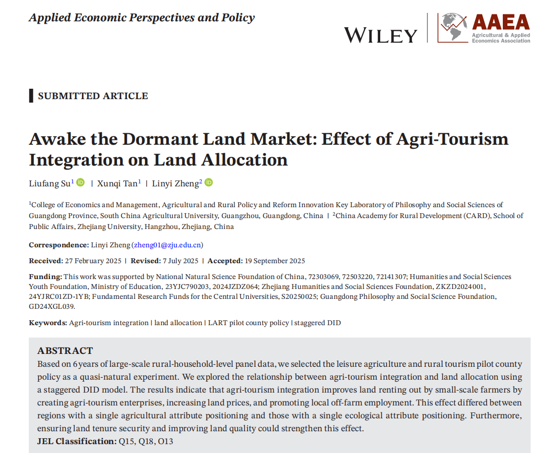 Su, L., Tian, X., Zheng, L*. Awake the dormant land market: Effect of agri-tourism integration on land allocation[J]. Applied Economic Perspectives and Policy, 2025, 1-22. https://doi.org/10.1002/aepp.70029.